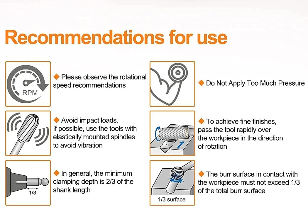 Using Carbide Rotary Burrs is a effective way to realize mechanization in hand workoperations. Generally use with handheld electric or pneumatic tool drive (can also be used in machine tool),Vast used in the industries of airplane, ship building, automobile, machinery, chemistry etc Carbide Rotary Burrs can be widely used in machining iron,steel casting,carbon steel,alloy steel,stainless steel,hardened steel,copper aluminium etc. Ideal for cleaning up welds, grinding weld beads, shaping parts,smoothing rough castings, or porting cylinder heads. Features & Benefits -Double Cut -First choice for general machining -Improves ease of control -Increases metal removal rate -Breaks swarf into small manageable pieces -Aluminium Cut -First choice for non ferrous materials and plastics -High helix and large flute volume for rapid metal removal. !!! Stay Safe!!! ⚠ Always ensure your burr shank is well inserted into your collet andclamped down tightly ⚠ Wear an eye mask to protect your eyes from filings