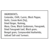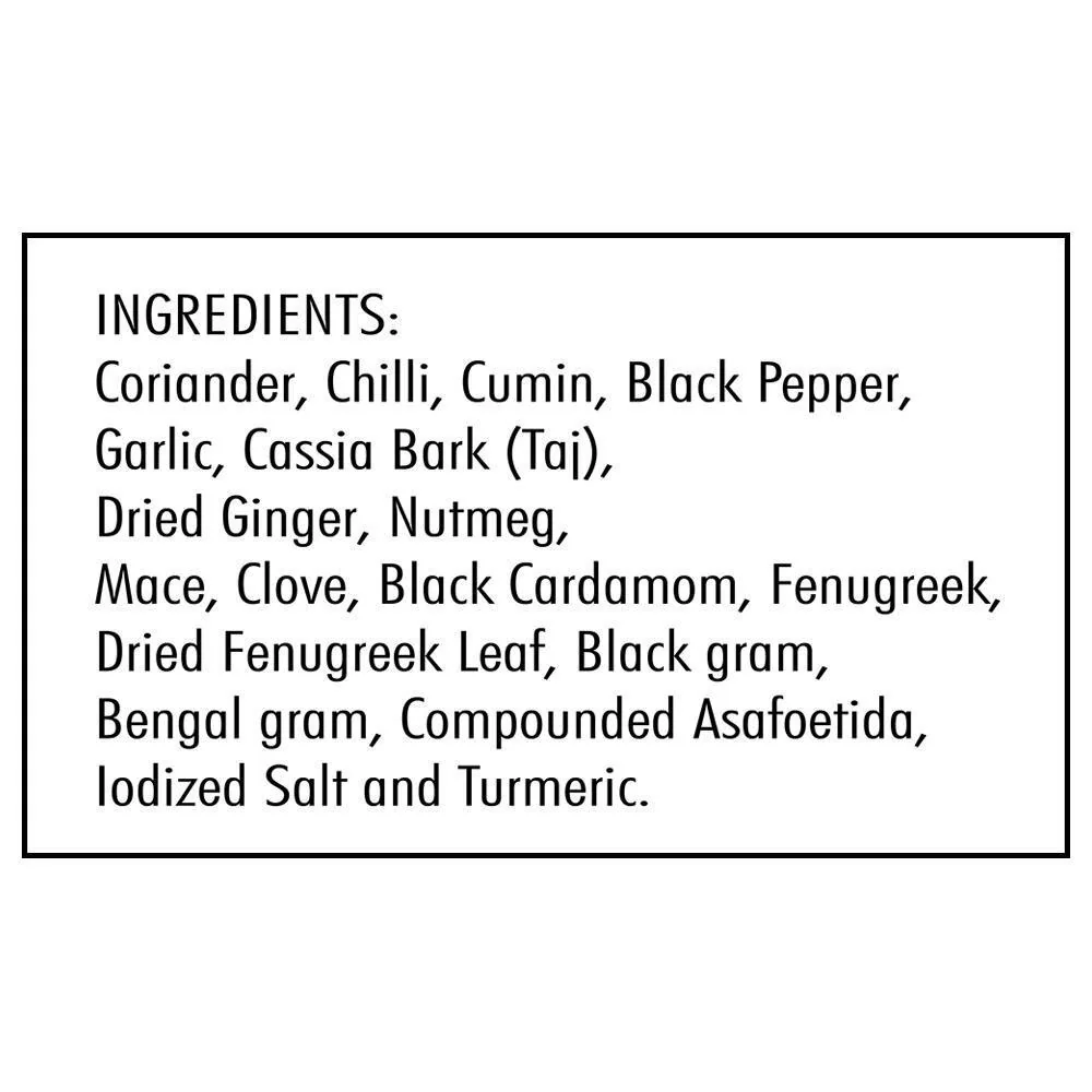 Coriander, Chilli, Cumin, black pepper, Garlic, Cassia bark (Taj), Dried ginger, Nutmeg, Mace, clove black cardamom, fenugreek, dried fenugreek leaf, black gram, bengal gram, compounded Asafoetida, iodized salt and Turmeric.