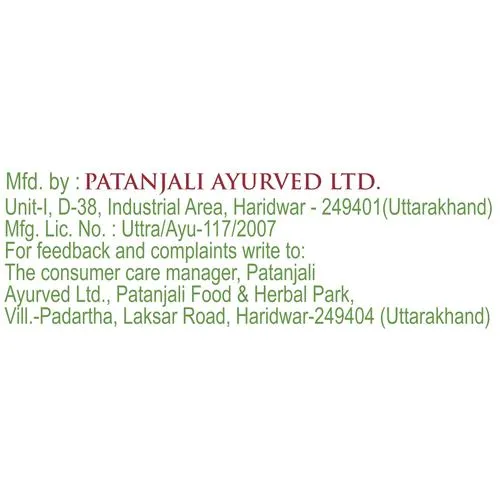 Manufactured & Marketed By: PATANJALI AYURVED LIMITED, Unit – I, D-38, Industrial Area, Haridwar – 249401, Uttrakhand India, .