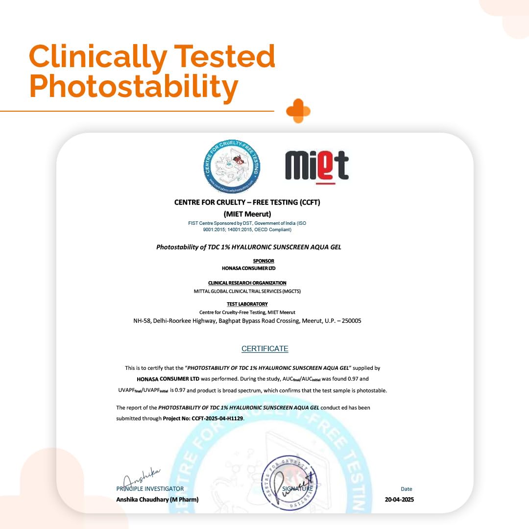 • The product was thoroughly tested in-vivo by an independent laboratory,, in accordance with the recognized protocols. The Derma Co 1% Hyaluronic Sunscreen Aqua Gel SPF 50 PA++++ is in vivo tested, meaning it has undergone real-life skin testing to assess its effectiveness and safety and a proof of the product actually delivering SPF 50 as claimed. The product has broad-spectrum protection against UVA, UVB, and blue light.