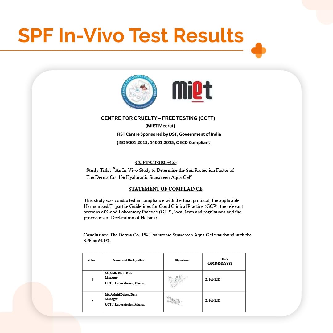 • The product was thoroughly tested in-vivo by an independent laboratory,, in accordance with the recognized protocols. The Derma Co 1% Hyaluronic Sunscreen Aqua Gel SPF 50 PA++++ is in vivo tested, meaning it has undergone real-life skin testing to assess its effectiveness and safety and a proof of the product actually delivering SPF 50 as claimed. The product has broad-spectrum protection against UVA, UVB, and blue light.