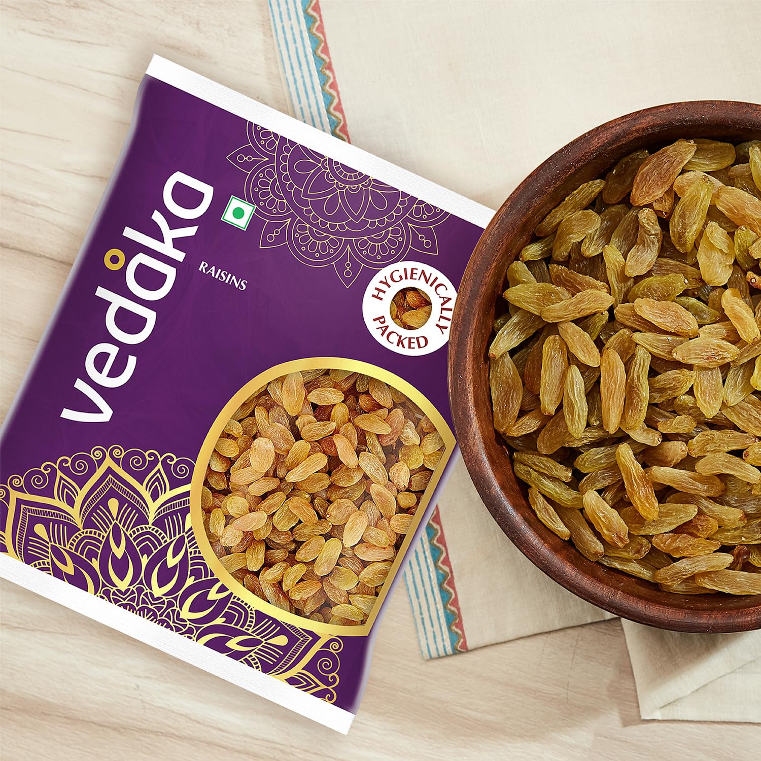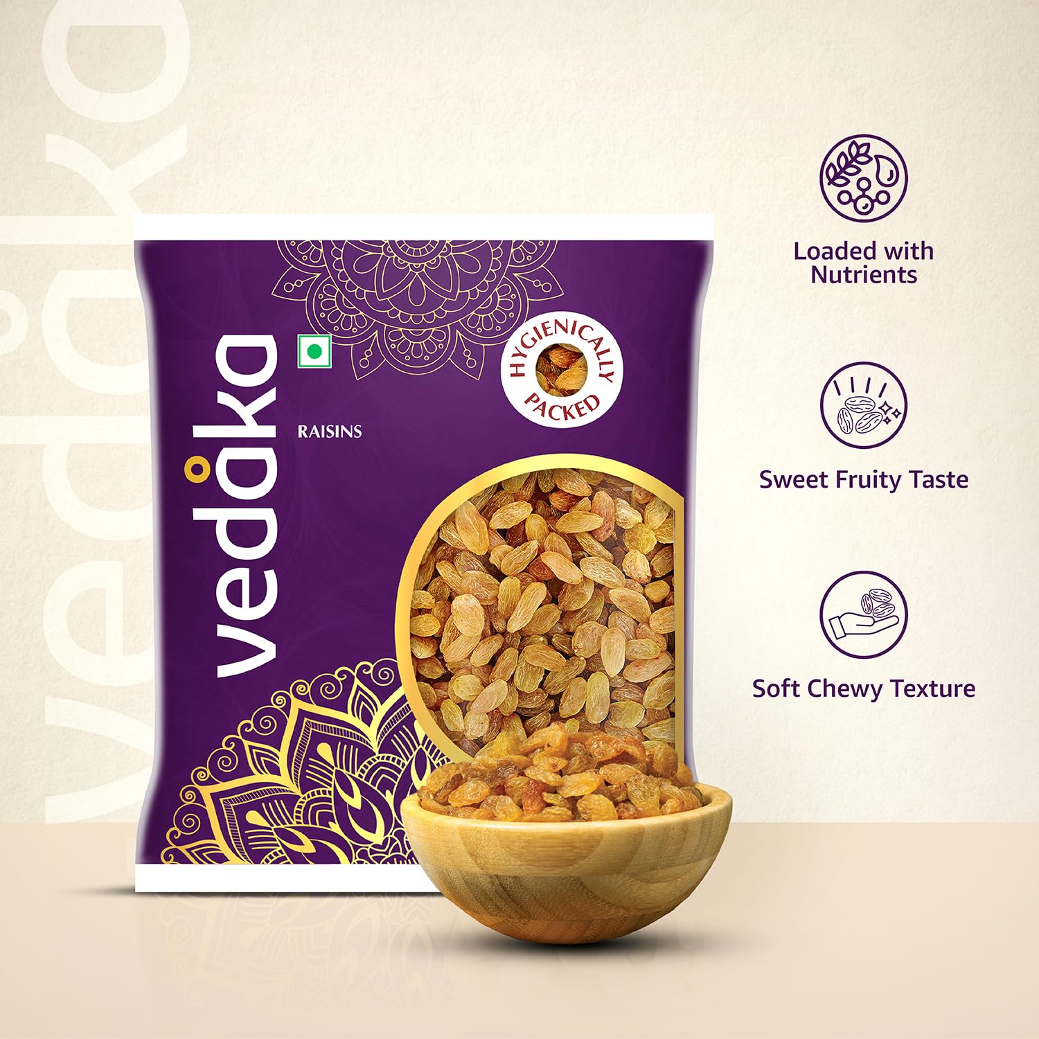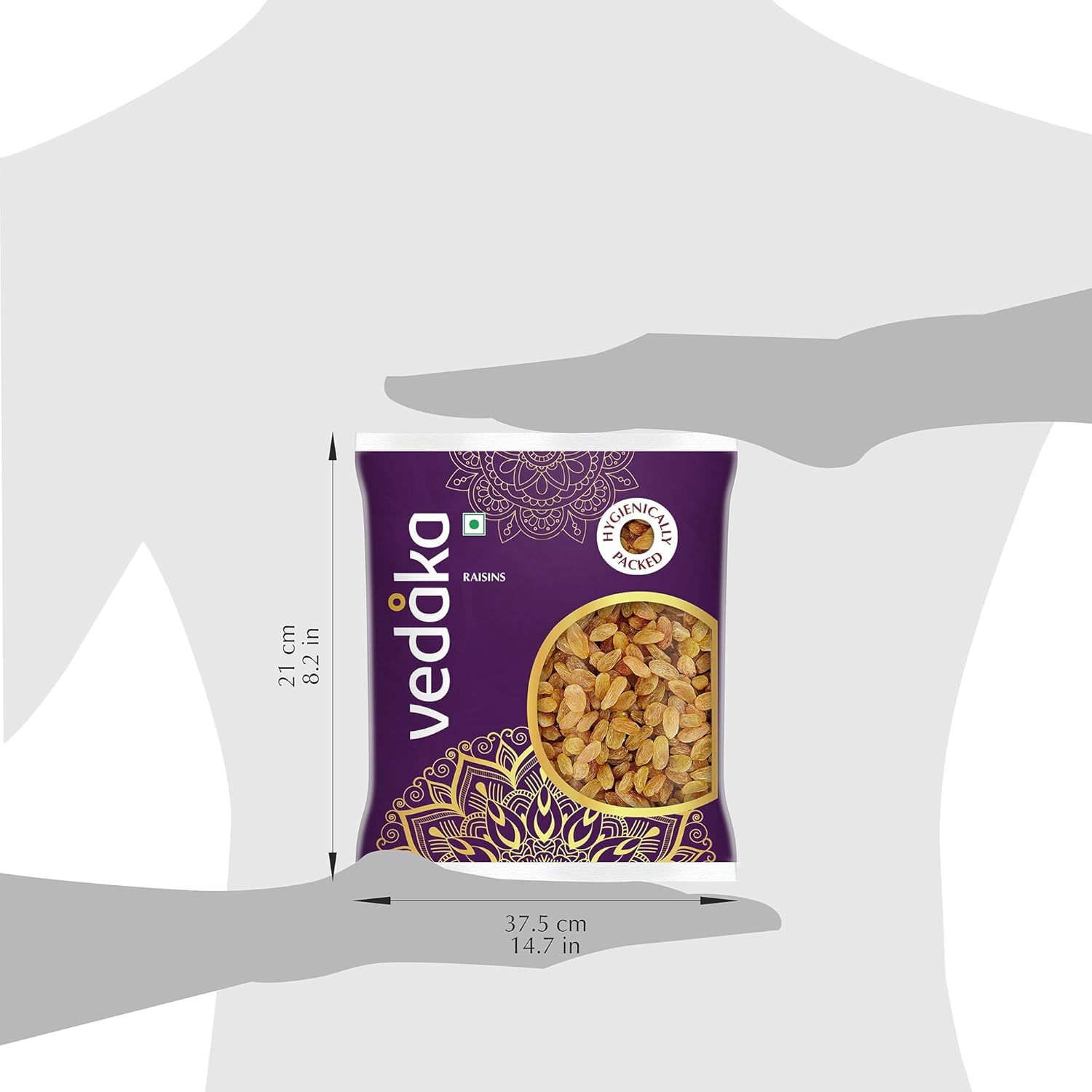 Introducing Vedaka Raisins. These raisins offer a sweet and fruity taste with a soft, chewy texture that is perfect for snacking. These regular-sized raisins are a wholesome, low-fat snack and rich in antioxidants, potassium, and fiber. Rigorously tested to meet high industry quality standards, they provide a great snacking option for on-the-go adventures. Packaged in a 500g pouch, these raisins are ideal for convenient, tasty snacking.